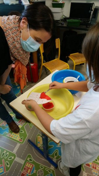 • Deuxième activité : après avoir réalisé le blason collectif de notre classe durant l’année scolaire, il était temps de pouvoir finaliser son propre blason à l’aide de sable coloré.