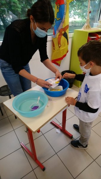 • Deuxième activité : après avoir réalisé le blason collectif de notre classe durant l’année scolaire, il était temps de pouvoir finaliser son propre blason à l’aide de sable coloré.