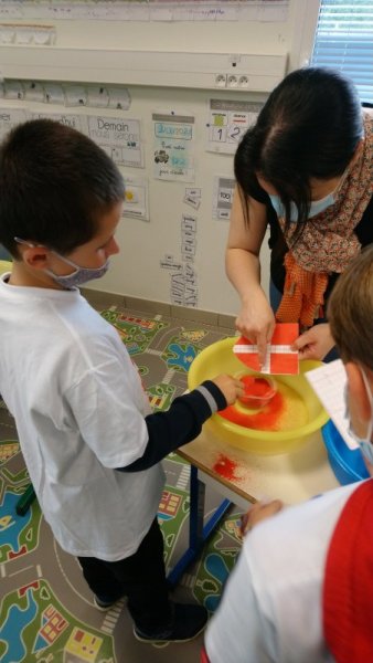 • Deuxième activité : après avoir réalisé le blason collectif de notre classe durant l’année scolaire, il était temps de pouvoir finaliser son propre blason à l’aide de sable coloré.