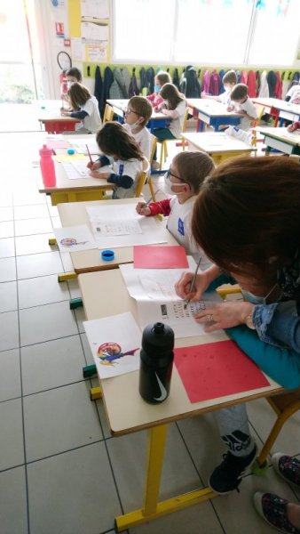 • Deuxième activité : après avoir réalisé le blason collectif de notre classe durant l’année scolaire, il était temps de pouvoir finaliser son propre blason à l’aide de sable coloré.