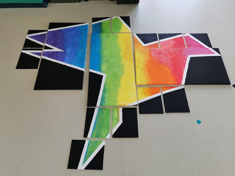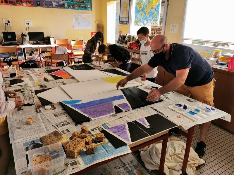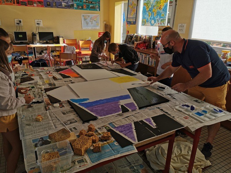 Les élèves ont collaboré et se sont relayés pour réaliser une oeuvre collective. Les dégradés de couleur, les mélanges, la peinture à l’éponge ont été appréciés pour colorer l’oiseau sur toile.