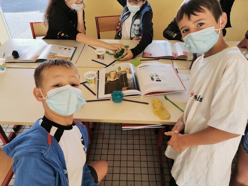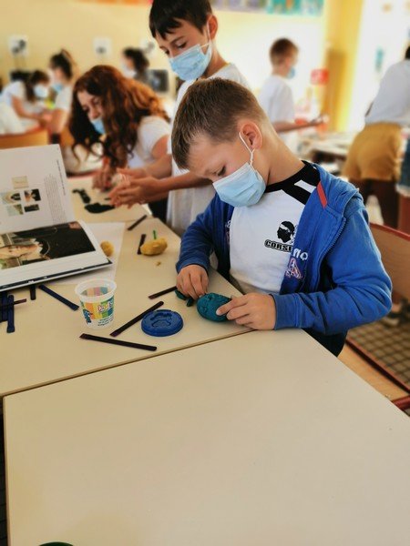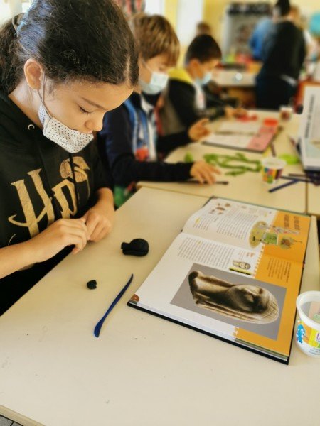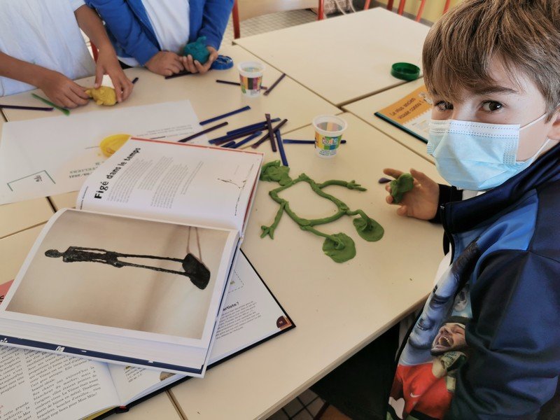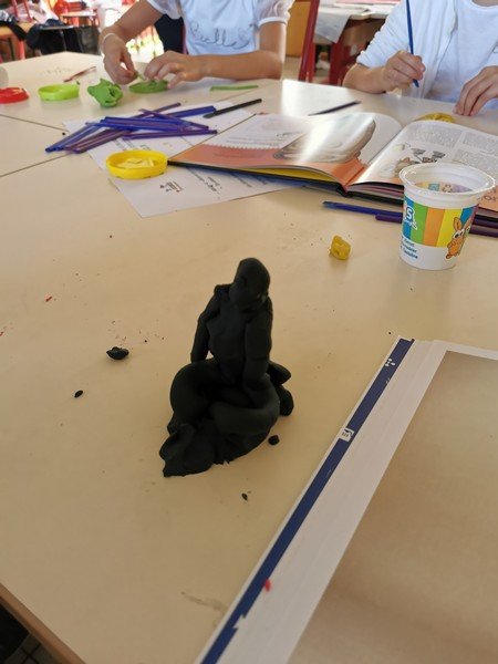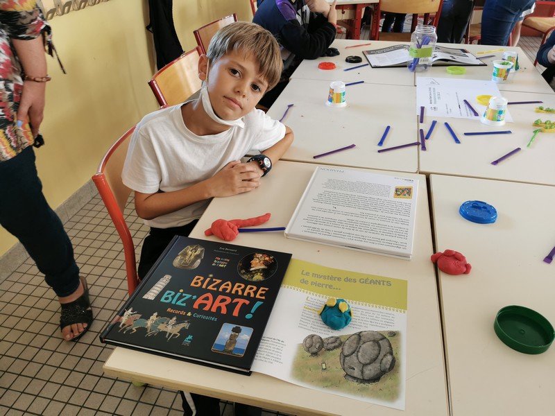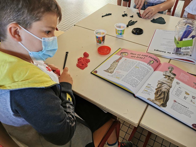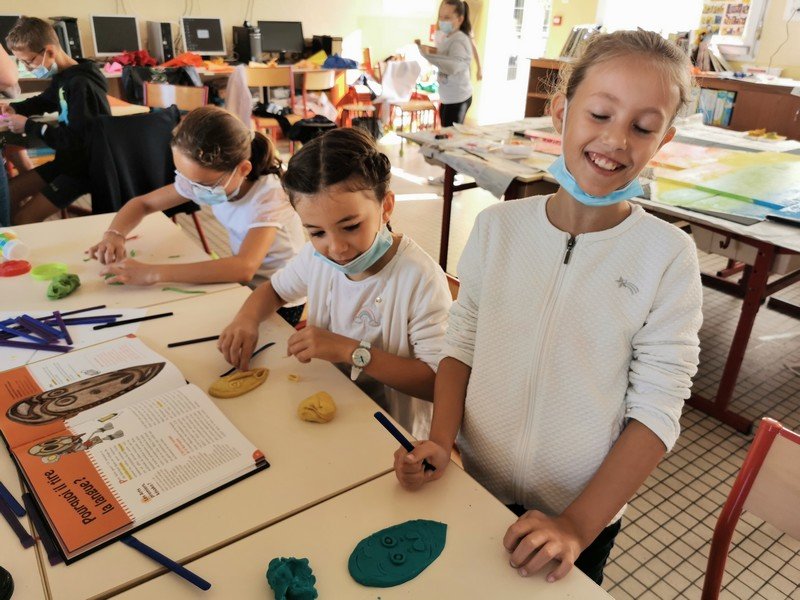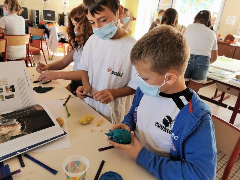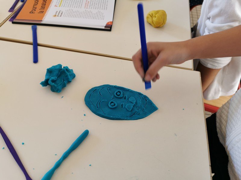 Pour cet atelier, les élèves devaient d’abord choisir une oeuvre dans un livre d’art, et tenter de la reproduire grâce à de la pâte à modeler. Les statues de l’ïle de Pâques, les masques africains, la vague d’Hokusai ont notamment été découverts…