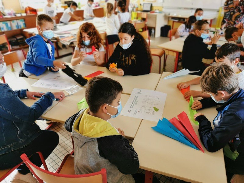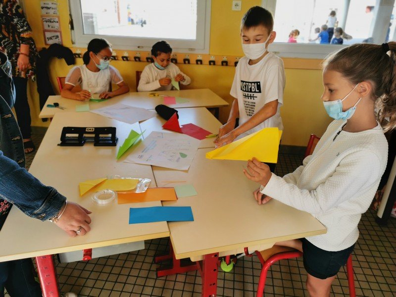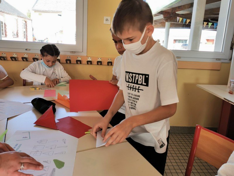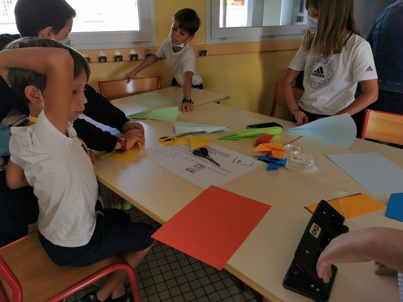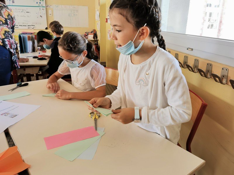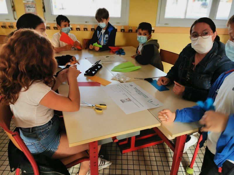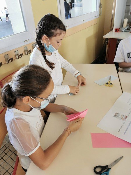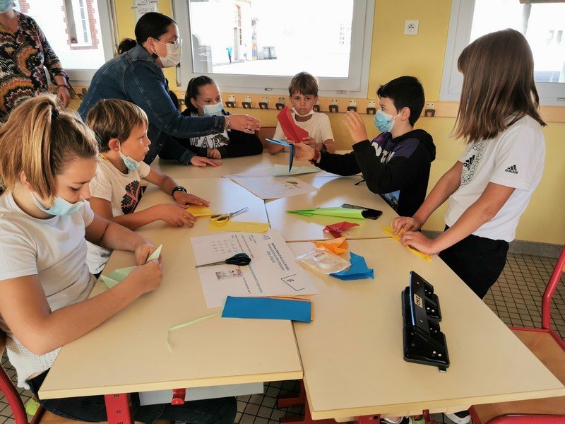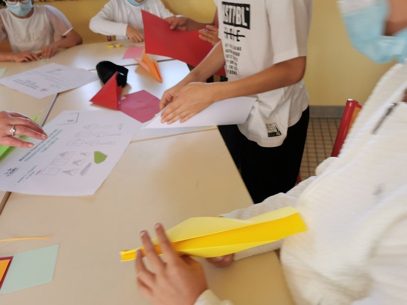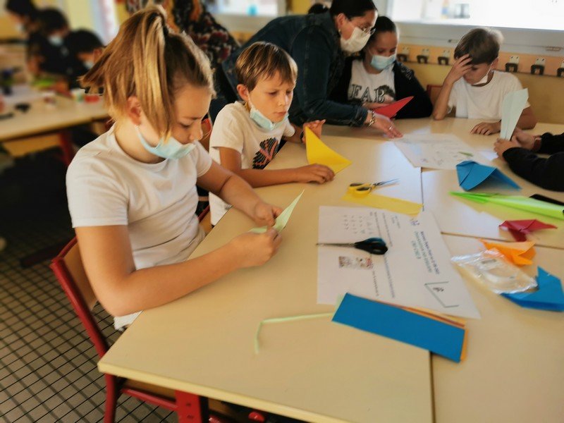 Les élèves ont pu réaliser des oiseaux ou avions en origami afin de réaliser une oeuvre où il sera nécessaire de lever les yeux pour admirer les réalisations “hautes en couleur”