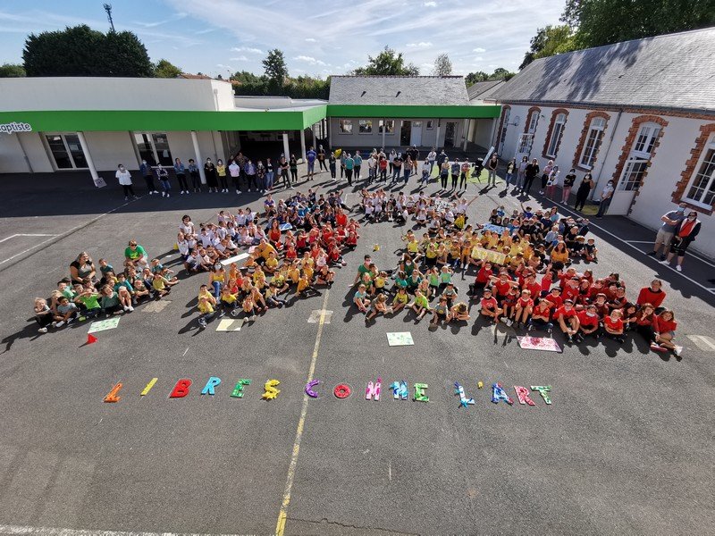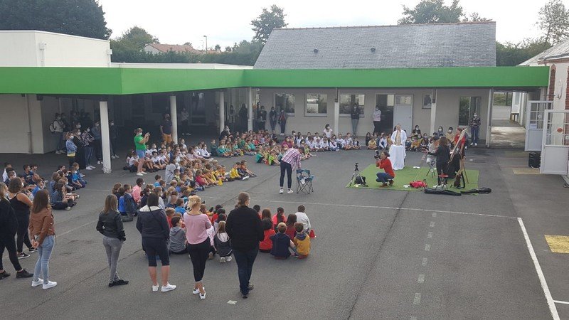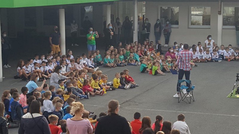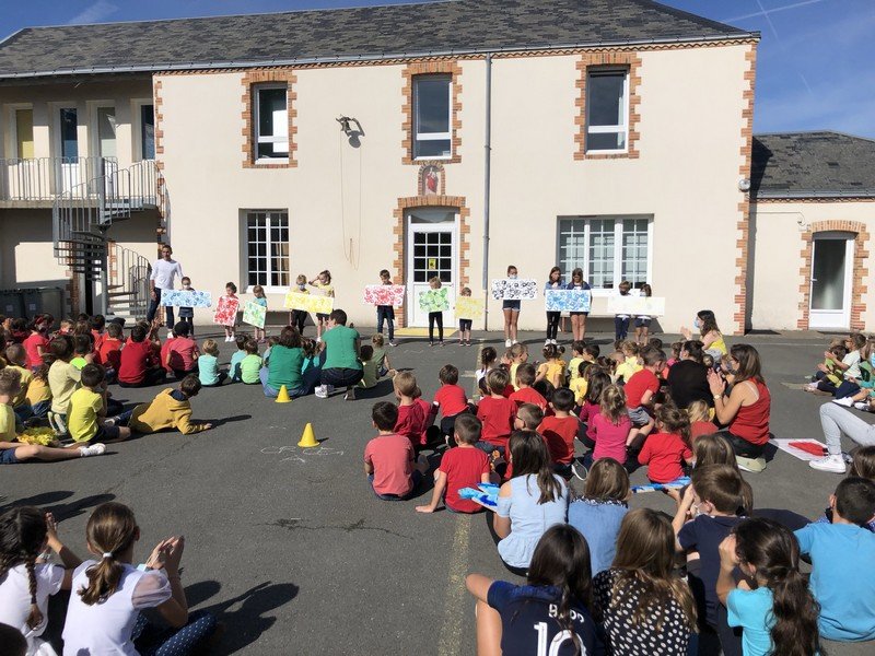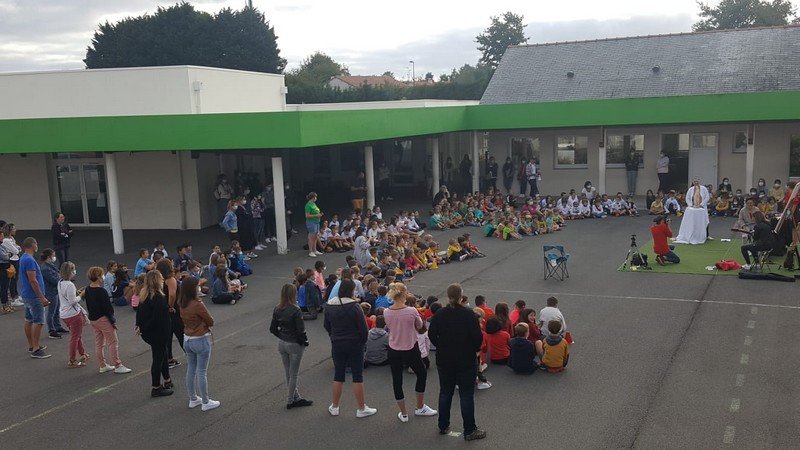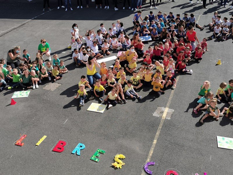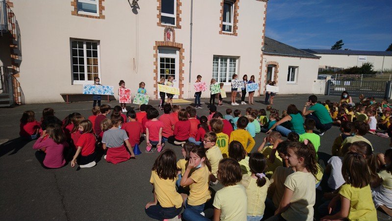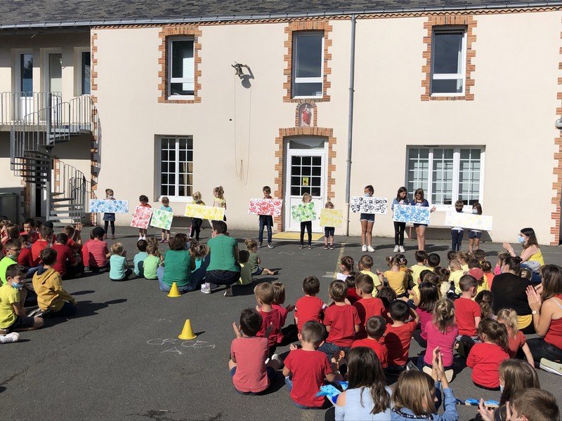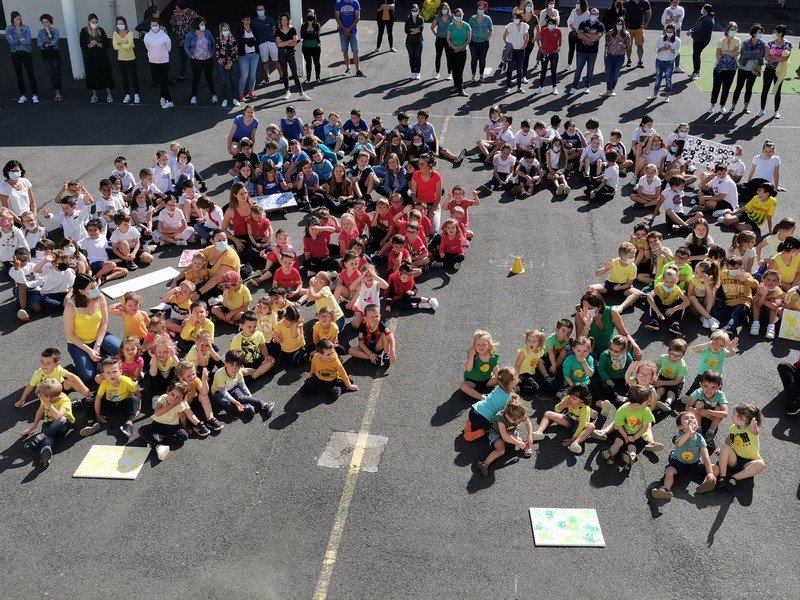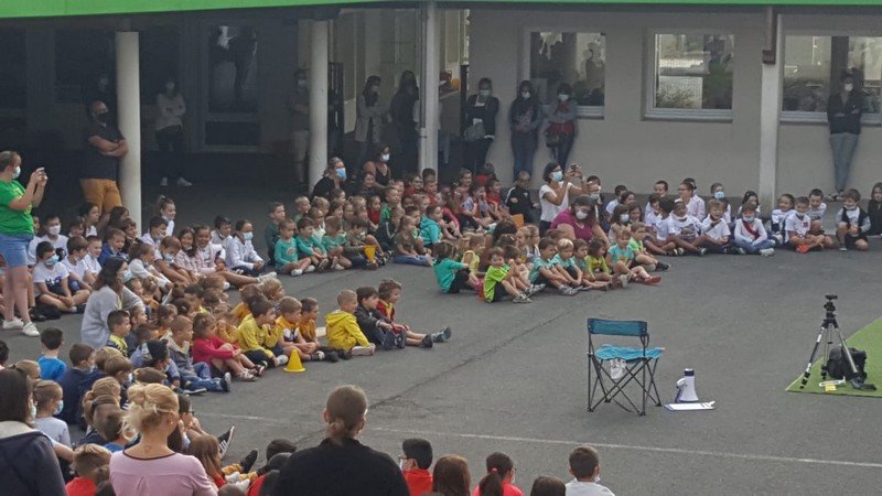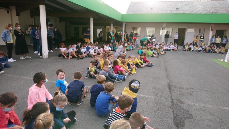 Comme d’habitude, la cloche a sonné à 9h00 mais … cette matinée particulière a débuté par un rassemblement de tous les élèves de l’école sur la cour élémentaire pour découvrir le thème de cette année scolaire 2021-2022.