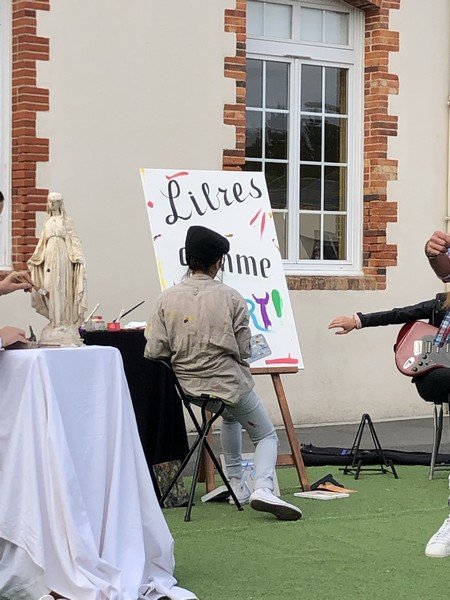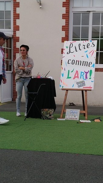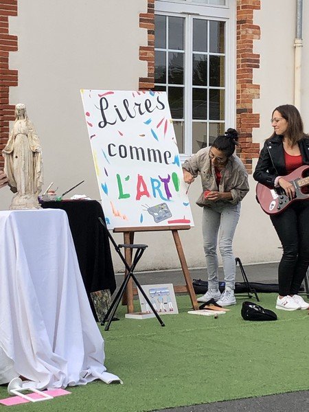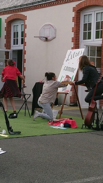 L’attention s’est alors portée sur la toile réalisée par Céline !! On pouvait admirer des couleurs, on pouvait également lire le titre du thème de cette année scolaire qui s’est dévoilé peu à peu, à coups de pinceaux :