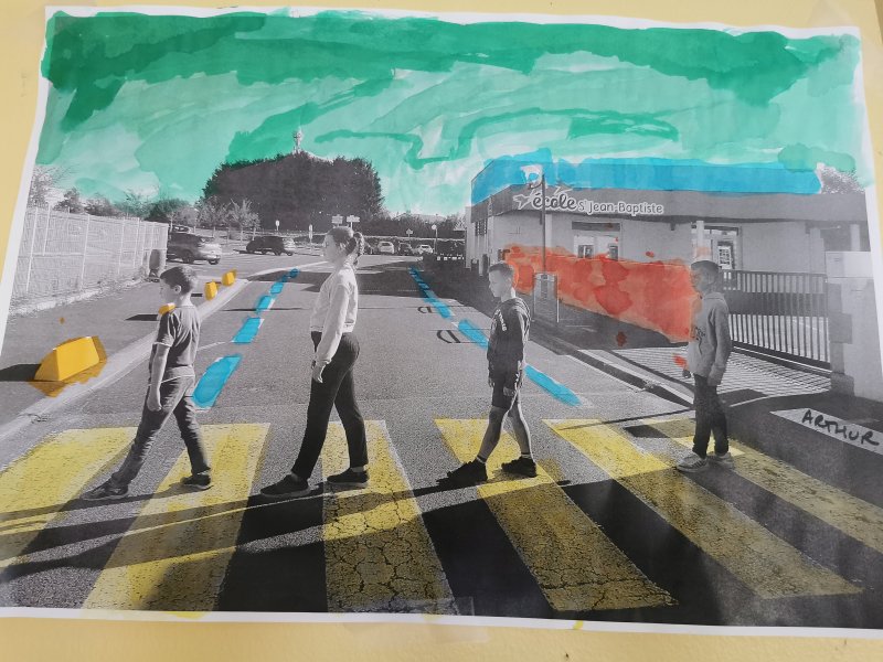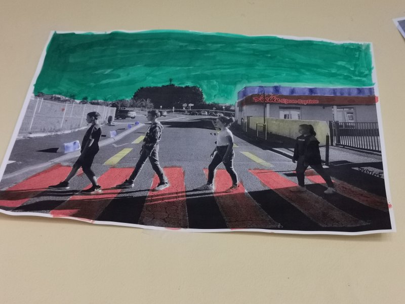 Cette séance s’est poursuivie par une production en arts visuels, en détournant la célèbre affiche de “ABBEY ROAD” des Beatles et en s’inspirant d’un courant artistique également découvert au cours de cette semaine : le POP ART.