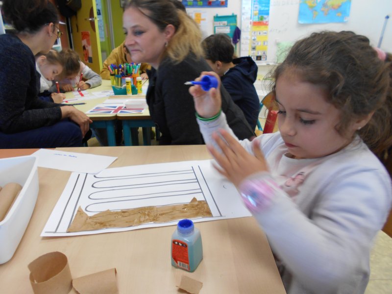 Dans cet atelier, nous avons participé à l’affichage d’un BIG BEN géant dans la classe, autour de notre pendule ! Pour cela, il fallait décorer la tour avec du papier kraft avec beaucoup de patience et de précision! La maman de Faustine nous a également fait découvrir une petite vidéo, qui précisait que BIG BEN est en réalité le nom de la CLOCHE .