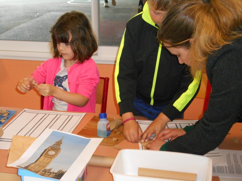 Dans cet atelier, nous avons participé à l’affichage d’un BIG BEN géant dans la classe, autour de notre pendule ! Pour cela, il fallait décorer la tour avec du papier kraft avec beaucoup de patience et de précision! La maman de Faustine nous a également fait découvrir une petite vidéo, qui précisait que BIG BEN est en réalité le nom de la CLOCHE .