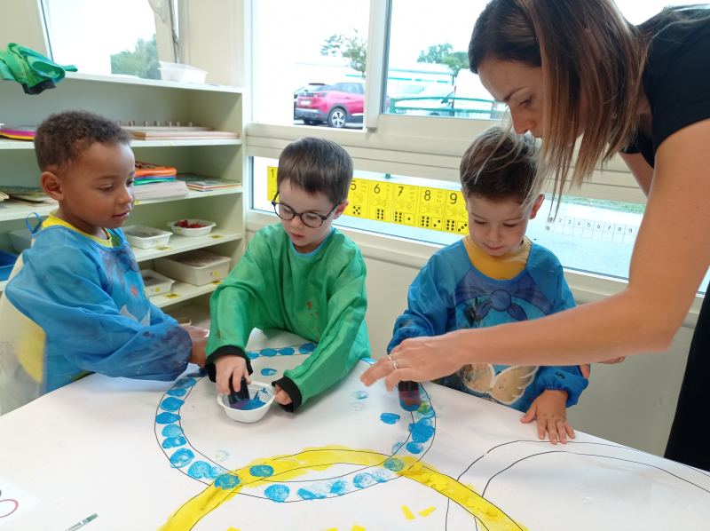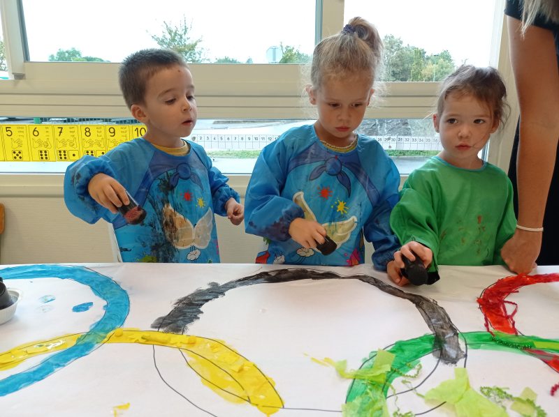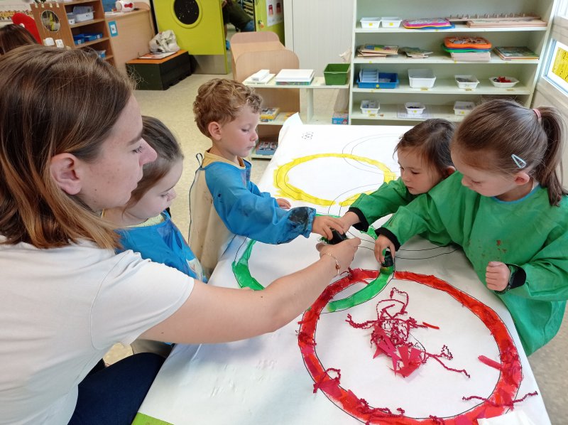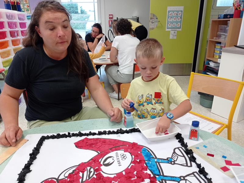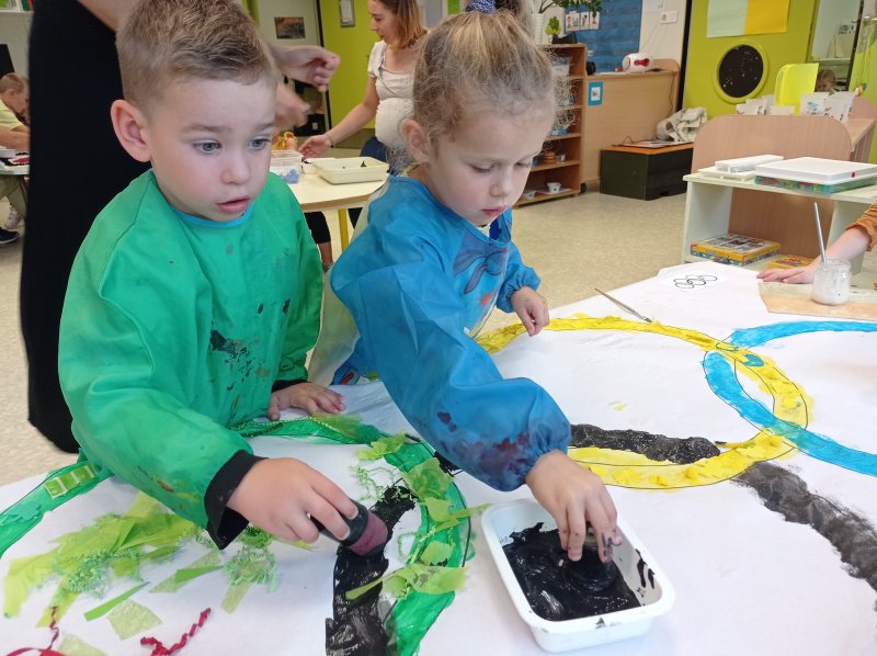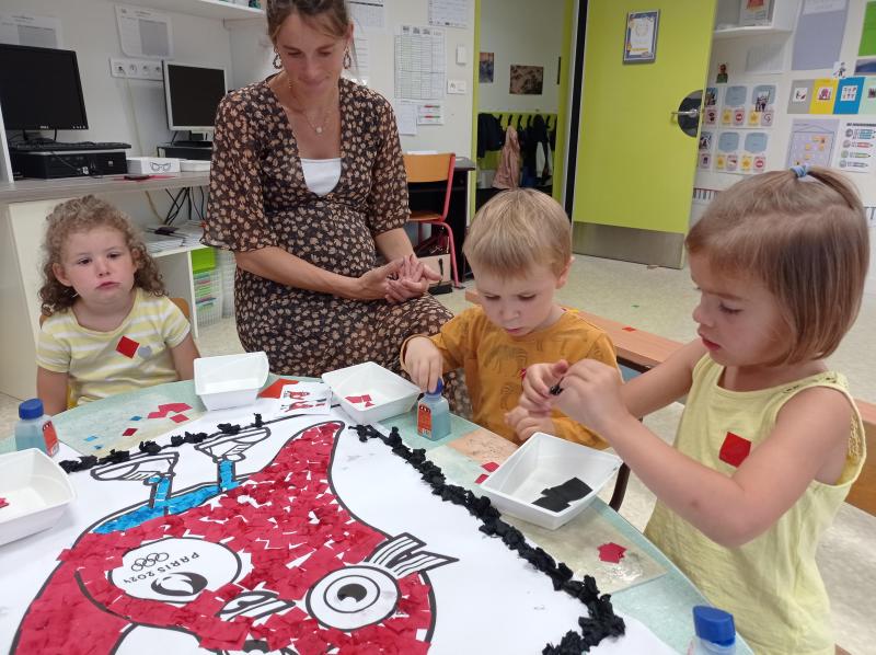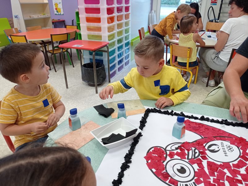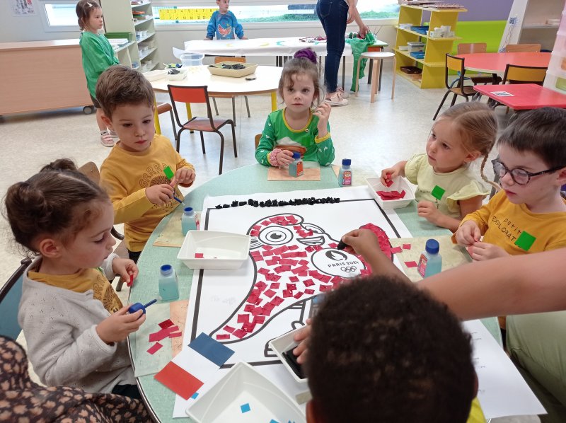 Nous avons donc réalisé plusieurs ateliers en lien avec les défis lancés par Phryge: décoration des anneaux olympiques, coloriage de Phryge, collage sur une grande Phryge et jeux sportifs.