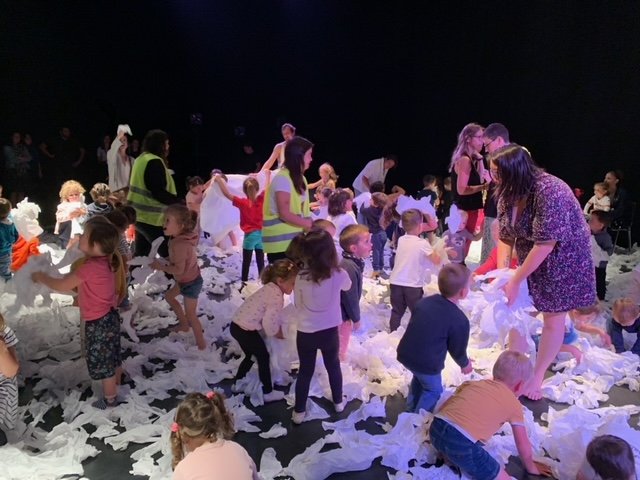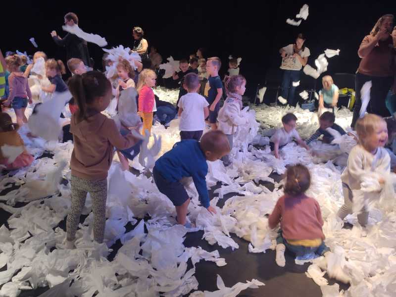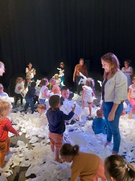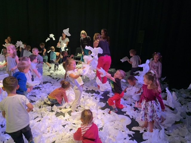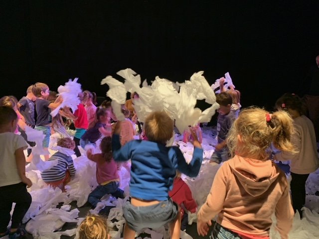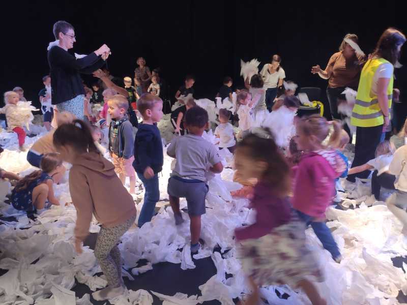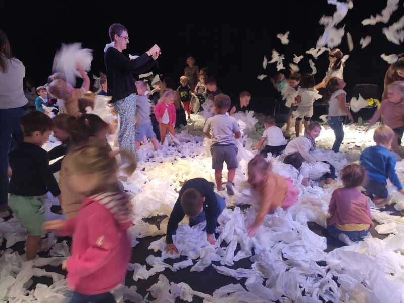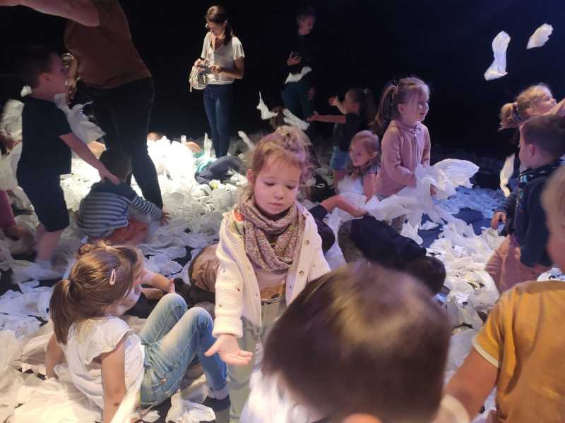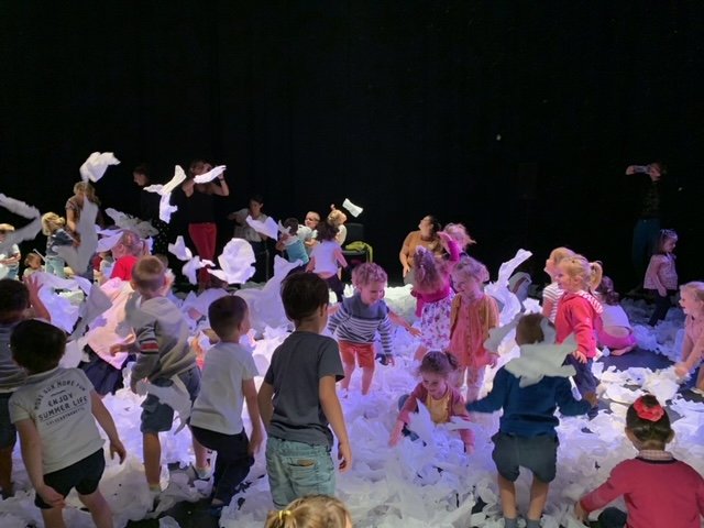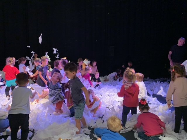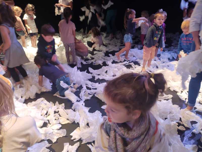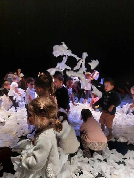 Le lundi 9 octobre, 3 classes de maternelle se sont rendues au théâtre Thalie à Montaigu pour y voir le spectacle “Sous la neige”.