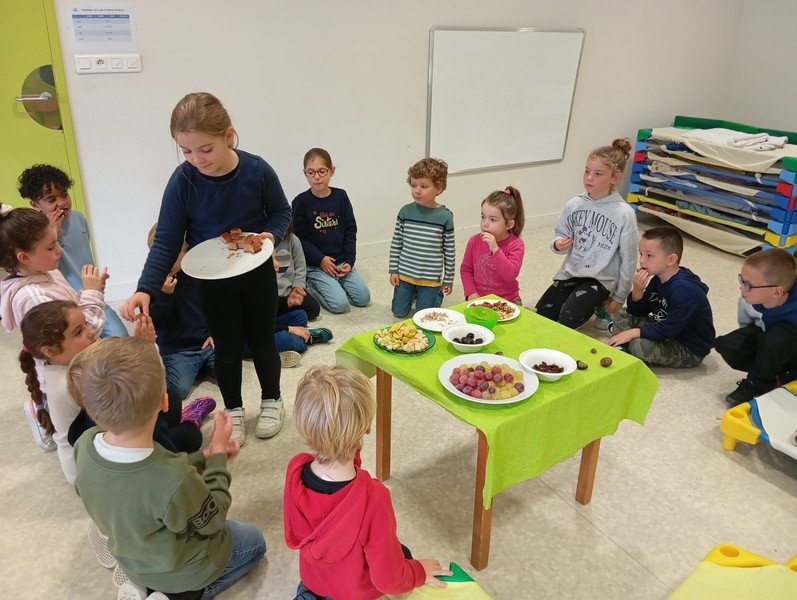 Mardi 15 octobre, les élèves de MS-GS et CE1-CE2 B se sont retrouvées pour partager un goûter d’anniversaire autour des fruits d’automne : châtaigne, raisins, pommes, poire, noix et noisettes. Cela a été l’occasion de découvrir de nouveaux goûts avec de belles surprises.