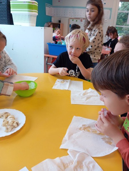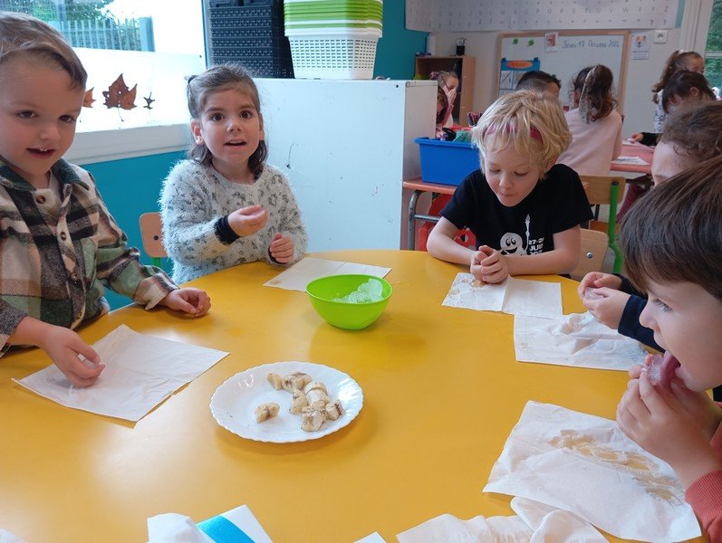 - Patienter quelques instants avant de manger un nouveau morceau de banane. Réactions : “il y a plus de goût”, “c’est sucré”.