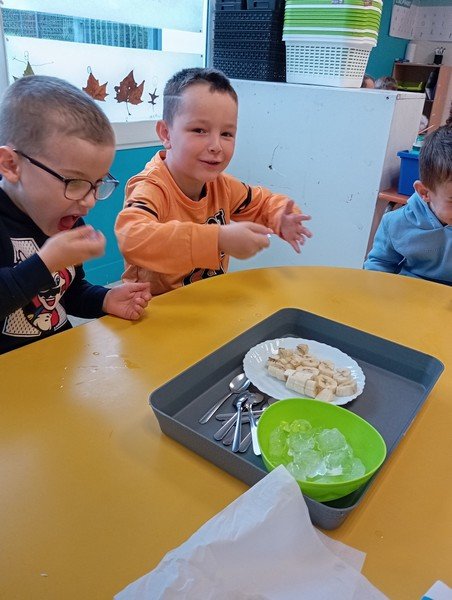 - Passer un glaçon sur la langue puis manger un morceau de banane. Réactions : “le glaçon c’est froid”. Pour le morceau de banane : “c’est mou”.