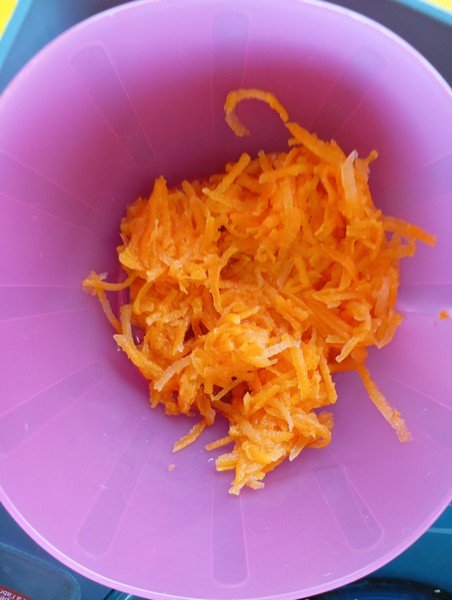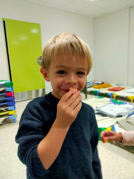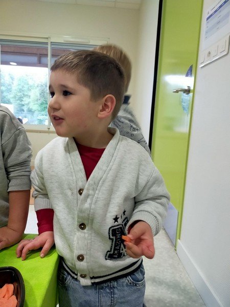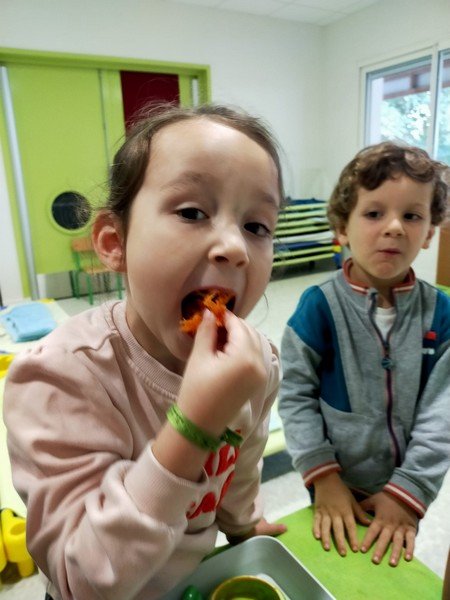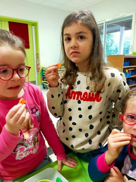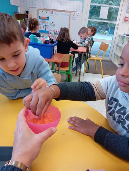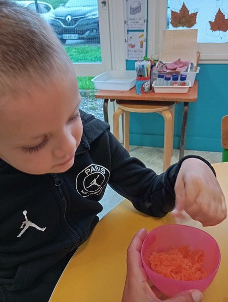 - La carotte râpée : “c’est bon”, “c’est mou”, “il y a de l’eau parce que c’est cuit”.
