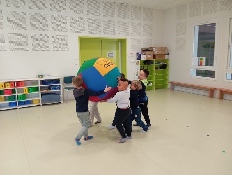 Le Kinball est une très grande baudruche gonflée dans un tissu. Nous l’avons utilisé pour développer la coordination et la coopération.