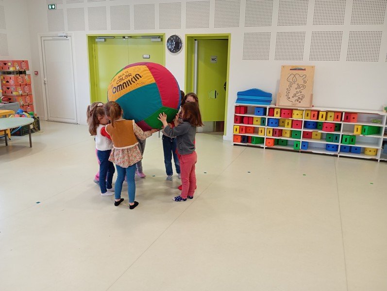 Le Kinball est une très grande baudruche gonflée dans un tissu. Nous l’avons utilisé pour développer la coordination et la coopération.