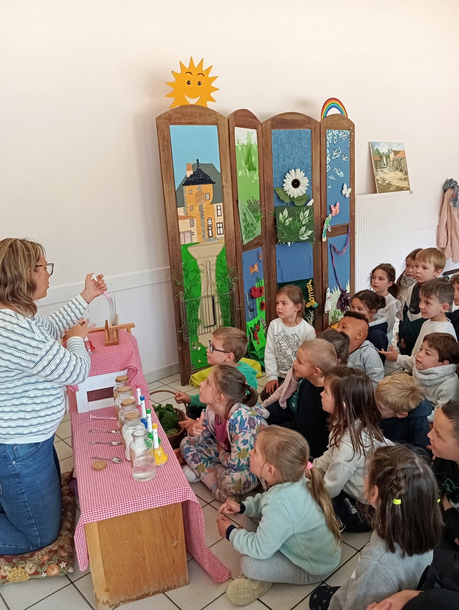 Samuel nous a aussi expliqué qu’avec le chou rouge du potager et une formule magique on pouvait fabriquer les couleurs de l’arc en ciel.