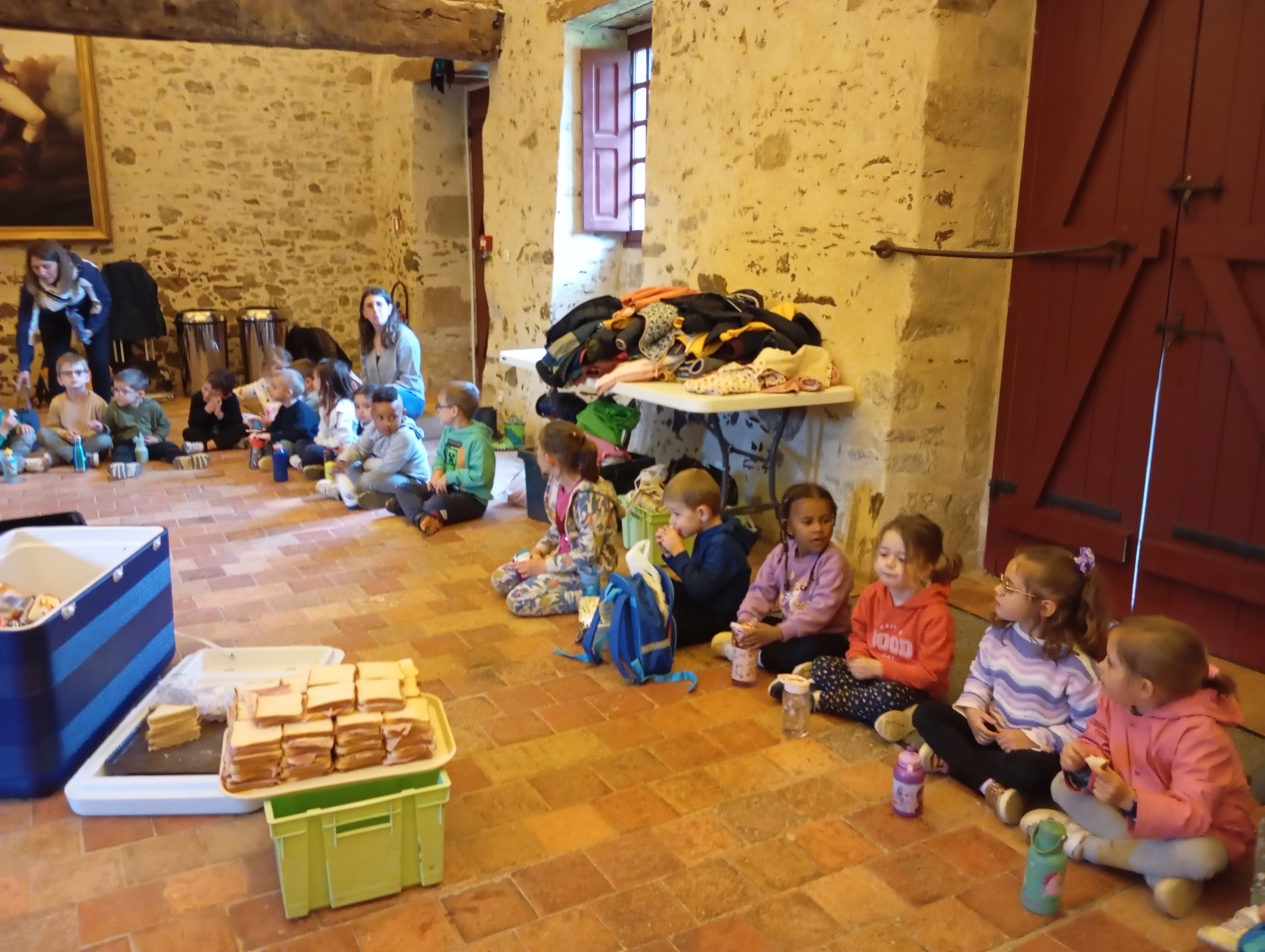 Le midi, le temps était incertain, alors nous avons pique-niqué dans la grange du Logis.