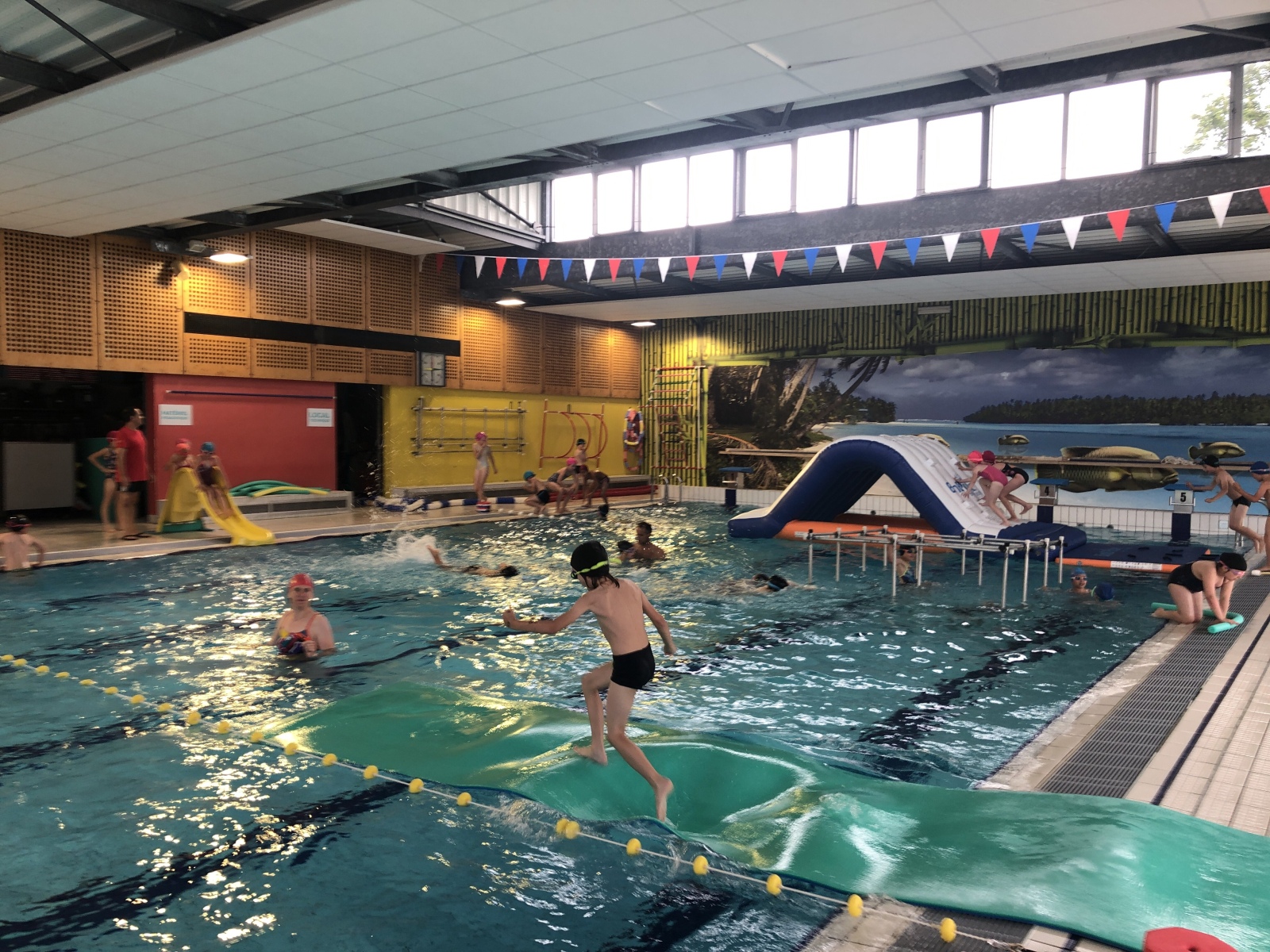 Jeudi 11 juin, pour leur dernière séance, les maitres nageurs avaient installé un parcours ludique: toboggans, structures gonflables, tapis, cage, anneaux lestés, … Quelle joie de pouvoir glisser, sauter, nager et partager de bons moments de rigolade entre camarades !
