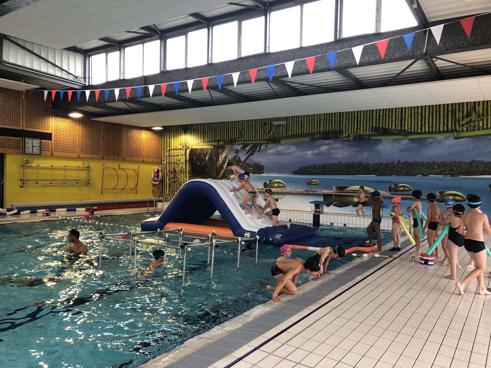 Jeudi 11 juin, pour leur dernière séance, les maitres nageurs avaient installé un parcours ludique: toboggans, structures gonflables, tapis, cage, anneaux lestés, … Quelle joie de pouvoir glisser, sauter, nager et partager de bons moments de rigolade entre camarades !