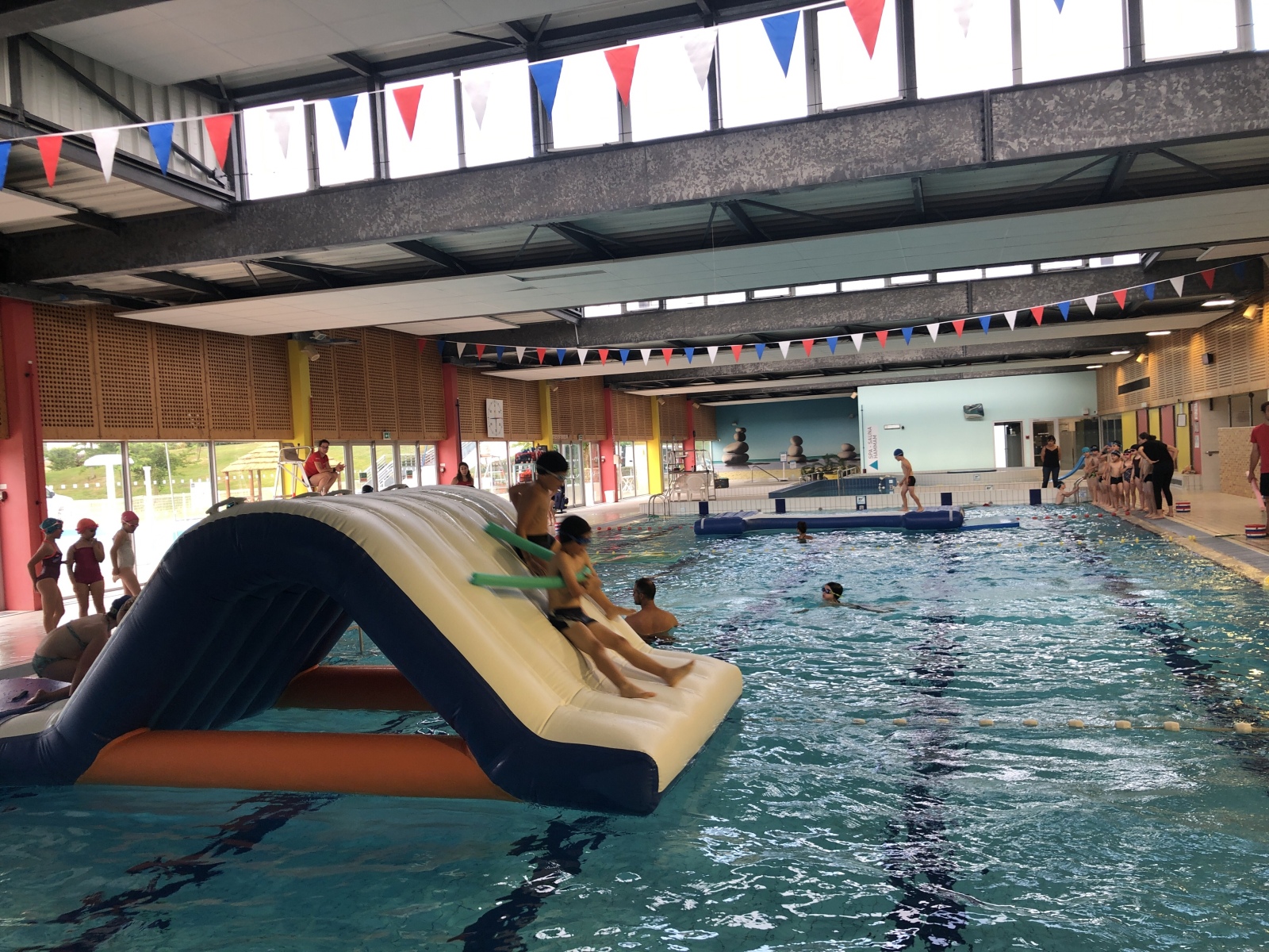 Jeudi 11 juin, pour leur dernière séance, les maitres nageurs avaient installé un parcours ludique: toboggans, structures gonflables, tapis, cage, anneaux lestés, … Quelle joie de pouvoir glisser, sauter, nager et partager de bons moments de rigolade entre camarades !