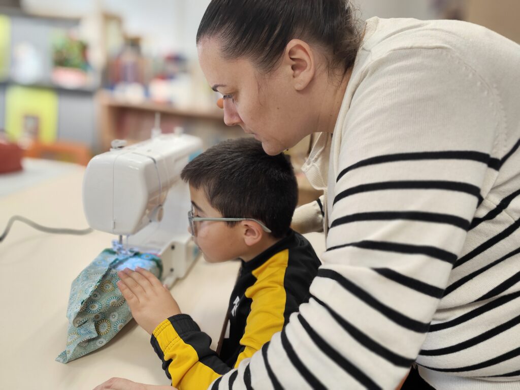 Au cours de ces dernières semaines, chaque jeudi après-midi, les élèves de CM1-CM2 B ont participé à un atelier couture. Ils se sont succédés par petits groupes de 4 pour réaliser des sachets en tissu : un pour eux, et un pour leur flleul(e) en CP-CE1. Encadrés par Magali et des mamies bénévoles, ils ont